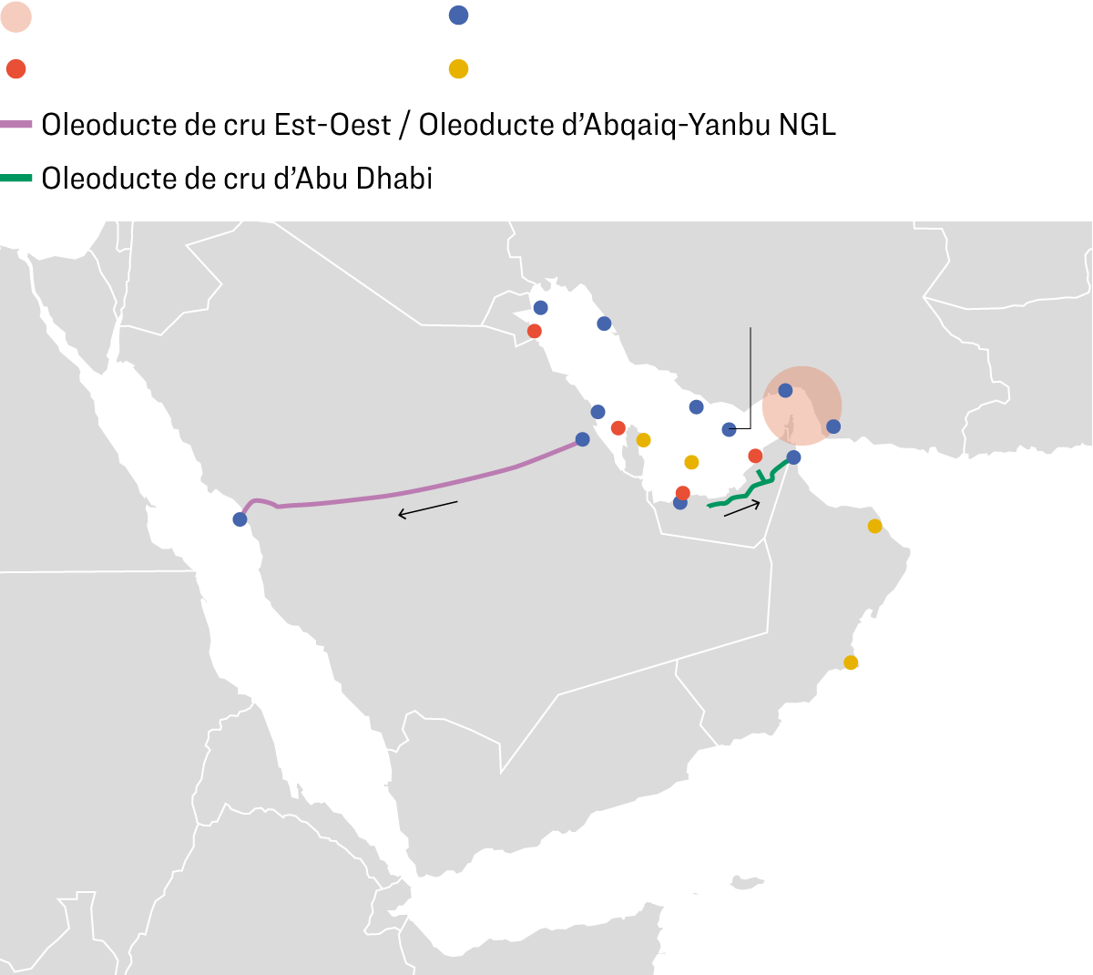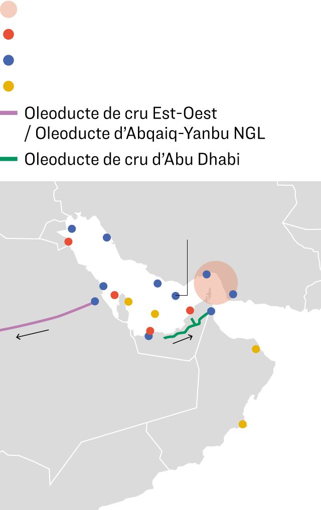 El 2025, es van exportar gairebé 20 mb/d de petroli a través de l'estret, però s'estima que només hi ha una capacitat disponible de 3,5 a 5,5 mb/d per exportar cru des del Golf per rutes alternatives, a través de l'oleoducte de l'Aràbia Saudita al mar Roig, Abqaiq-Yanbu, i de l'oleoducte dels Emirats Àrabs Units al port de Fujayra, l'ADCOP, com es pot veure en el mapa.