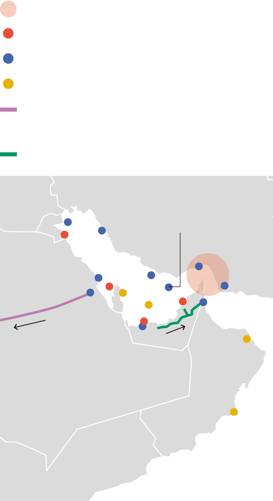En el cas del gas, no hi ha rutes alternatives per al transport des de Qatar o els Emirats Àrabs Units al mercat global, excepte les instal·lacions de liqüefacció de GNL existents. Qatar subministra gas per canalització als Emirats Àrabs Units i Oman a través del gasoducte Dolphin (gairebé 20,5 bcm el 2025). No obstant això, el gasoducte té una capacitat disponible limitada, i les terminals d'exportació de GNL d'Oman van assolir una taxa d'utilització propera al 100% el 2025. Com en el cas del cru, els mercats asiàtics són la principal destinació del GNL de Qatar i els Emirats Àrabs Units. El 2025, gairebé el 90% del volum total exportat a través de l'estret d'Ormuz es va destinar al mercat asiàtic, mentre que la proporció per a Europa va ser de poc més del 10%. Alhora, el GNL transportat a través de l'estret va representar al voltant del 27% de les importacions totals de GNL d'Àsia el 2025 i aproximadament el 7% de les entrades totals de GNL a Europa durant el mateix període, segons les dades de l'AIE.